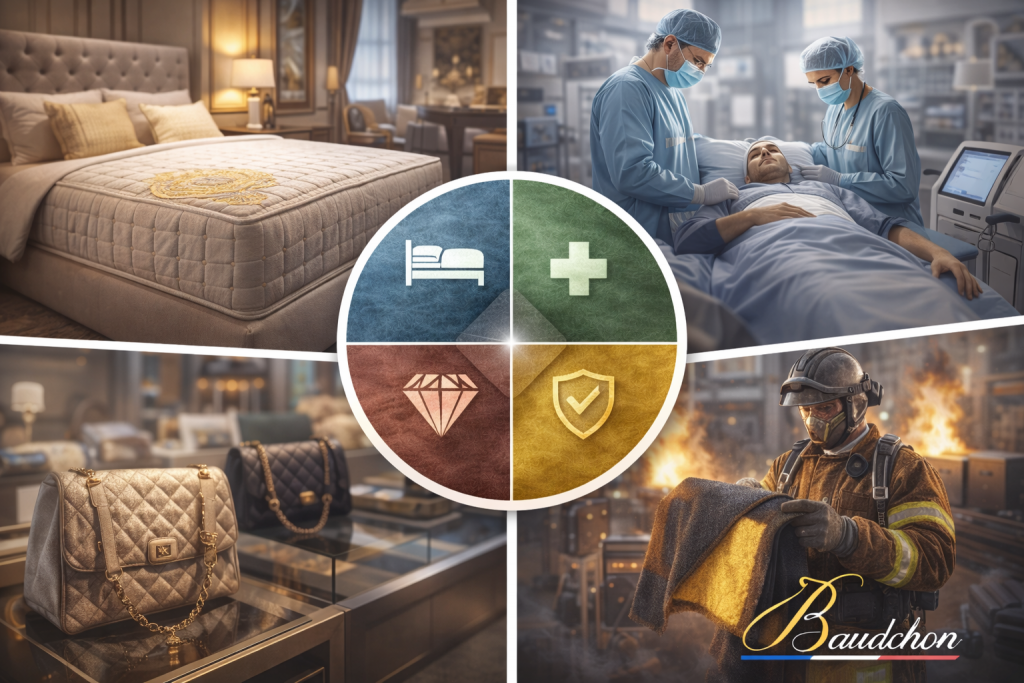 Les solutions textiles Baudchon sont développées pour répondre précisément à ces contraintes, en intégrant dès la conception :